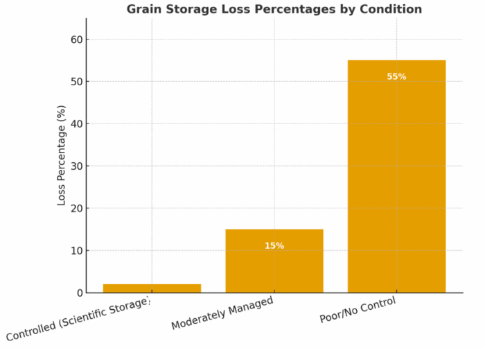 - Losses in storage alone may account for 10–20% of stored grain in many systems.