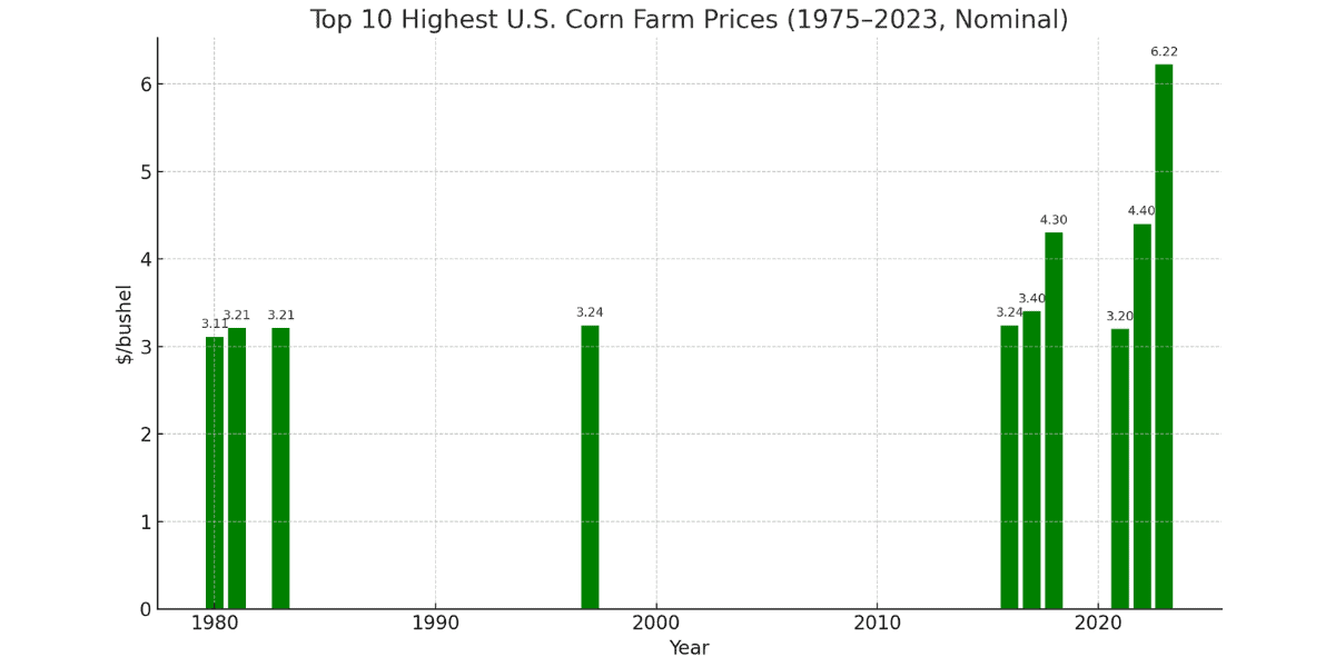 Corn’s most expensive years line up with well-known crises: the 2012 drought, the ethanol demand boom of the late 2000s, and the COVID-era disruptions of 2021–22.