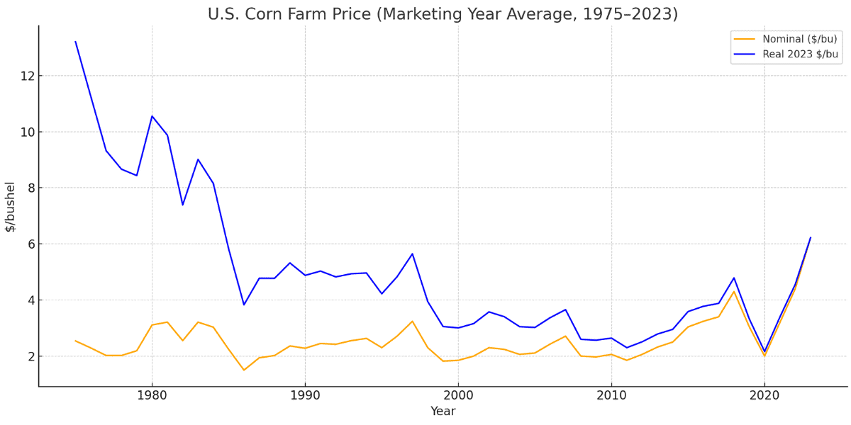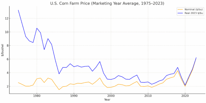 - What happened: A global grain squeeze and export surge in the 1970s pushed corn prices up. But by the early 1980s, high interest rates and overexpansion triggered the Farm Crisis, leaving many farmers squeezed.