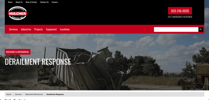 Hulcher Services is a long-established railroad service contractor with 24/7 emergency response capabilities. They provide a full suite of derailment response services that include clearing derailments, rerailing, removing damaged cars and track, load-out and tie-down of equipment, and cleanup/stockpiling of spilled materials and commodities. Their 24/7 call center and strategically located divisions allow rapid mobilization nationwide. Hulcher also offers post-spill cleanup and load transfer services as part of larger derailment recovery projects.