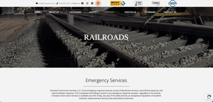 Choctaw Construction Services, LLC (CCS) offers emergency response services that include derailment assistance alongside storm and natural disaster response. Their derailment work involves coordinating response plans, removing debris, transporting damaged cars and freight, and assisting with cleanup and track restoration. CCS has a fleet of specialized rail and heavy equipment and coordinates emergency response planning, dispatch, and execution.