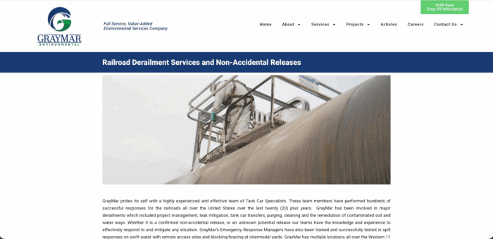 GrayMar Environmental provides railroad derailment services and non-accidental releases through its experienced team of tank car specialists. They handle derailment project management, tank car transfers, leak mitigation, railyard remediation, and waste transportation and disposal. GrayMar’s services extend into broader emergency response and waste handling, supported by trained teams capable of handling cleanup and transfer operations associated with derailments.