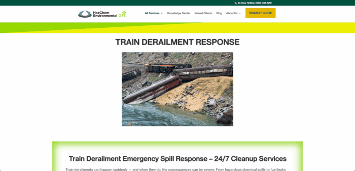 HazChem Environmental offers comprehensive emergency spill and derailment response services, with a focus on hazardous and non-hazardous spill containment, cleanup, and disposal. Their HAZWOPER-certified crews are available 24/7 for incidents ranging from minor spills to complex emergencies involving chemicals, fuel, and other contaminants. HazChem also provides environmental site remediation and coordinated cleanup for derailment incidents that involve hazardous materials.