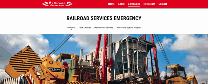 R.J. Corman Railroad Services provides railroad construction, maintenance-of-way, and emergency response services through strategically located divisions across the U.S. Their emergency services include 24/7 dispatch to assist with derailment response, re-railing locomotives and rail cars, and post-derailment cleanup. They work with a wide range of rail infrastructure needs, combining cleanup with broader rail construction and track services.